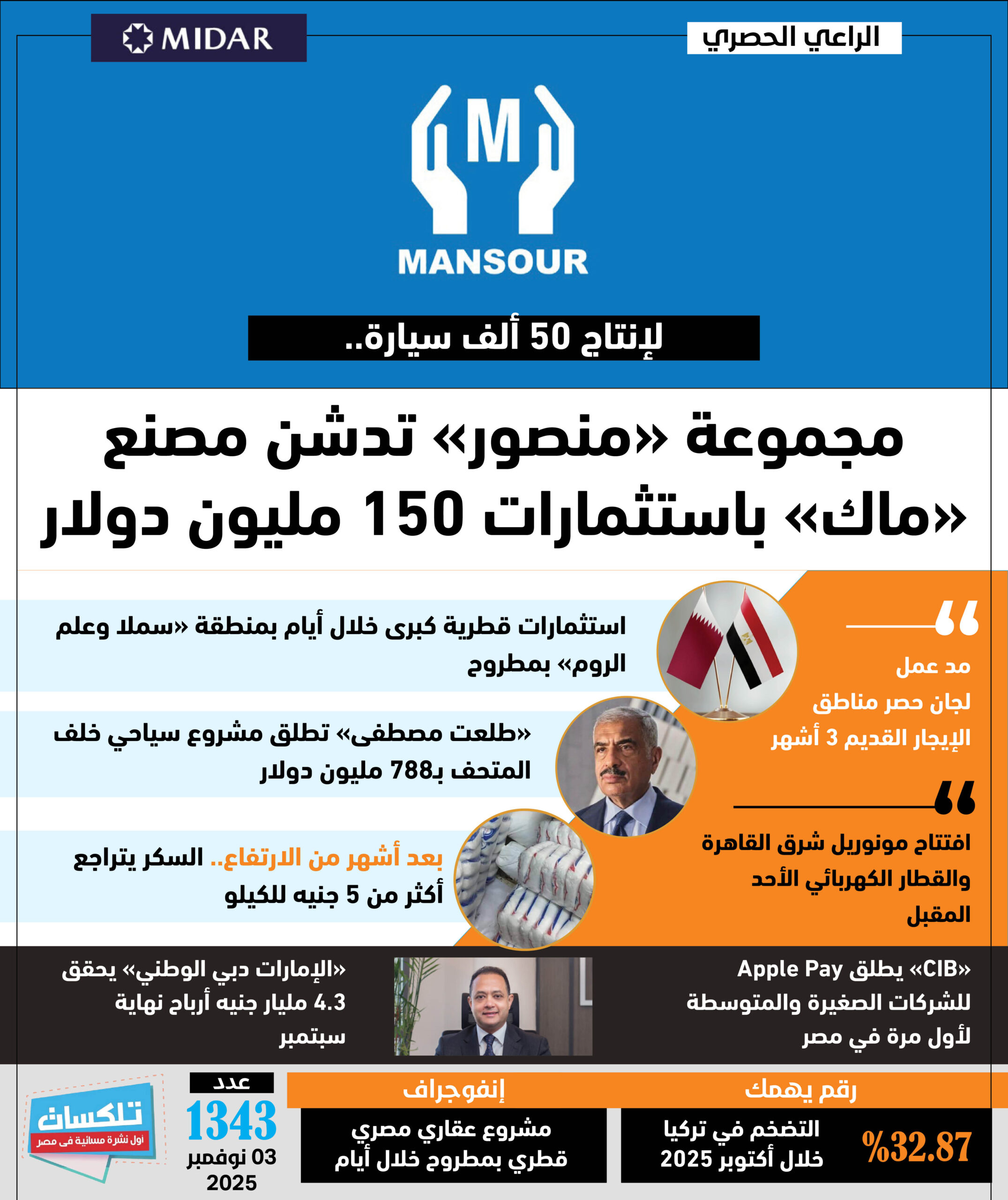 أول نشرة إخبارية مسائية فى مصر تطلقها جريدة الاستثمار العربى تأتيكم قبل العاشرة يوميا من الأحد إلى الخميس ..ونقرأ فيها ما يلي: