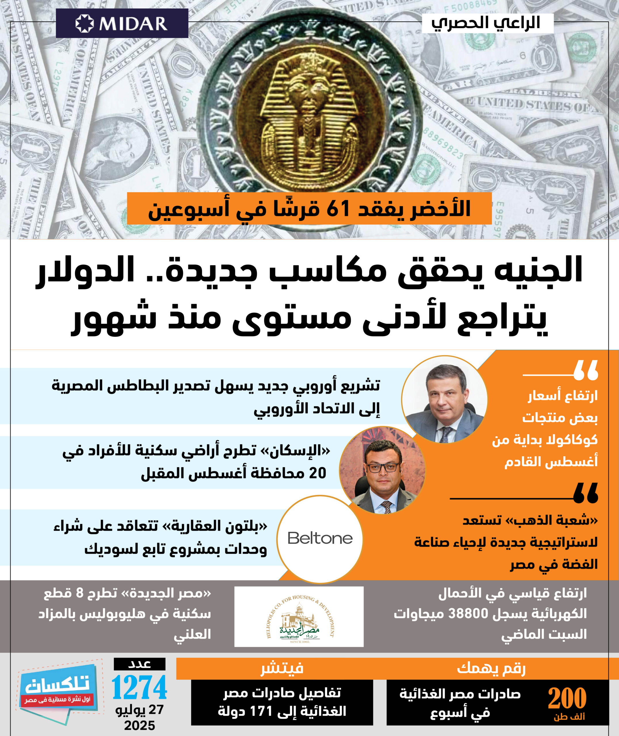 | 34554.24 نقطة | 1.26 % | 4.15 مليار جنيه | 13 مليار جنيه (ربح) | 2.424 تريليون جنيه |