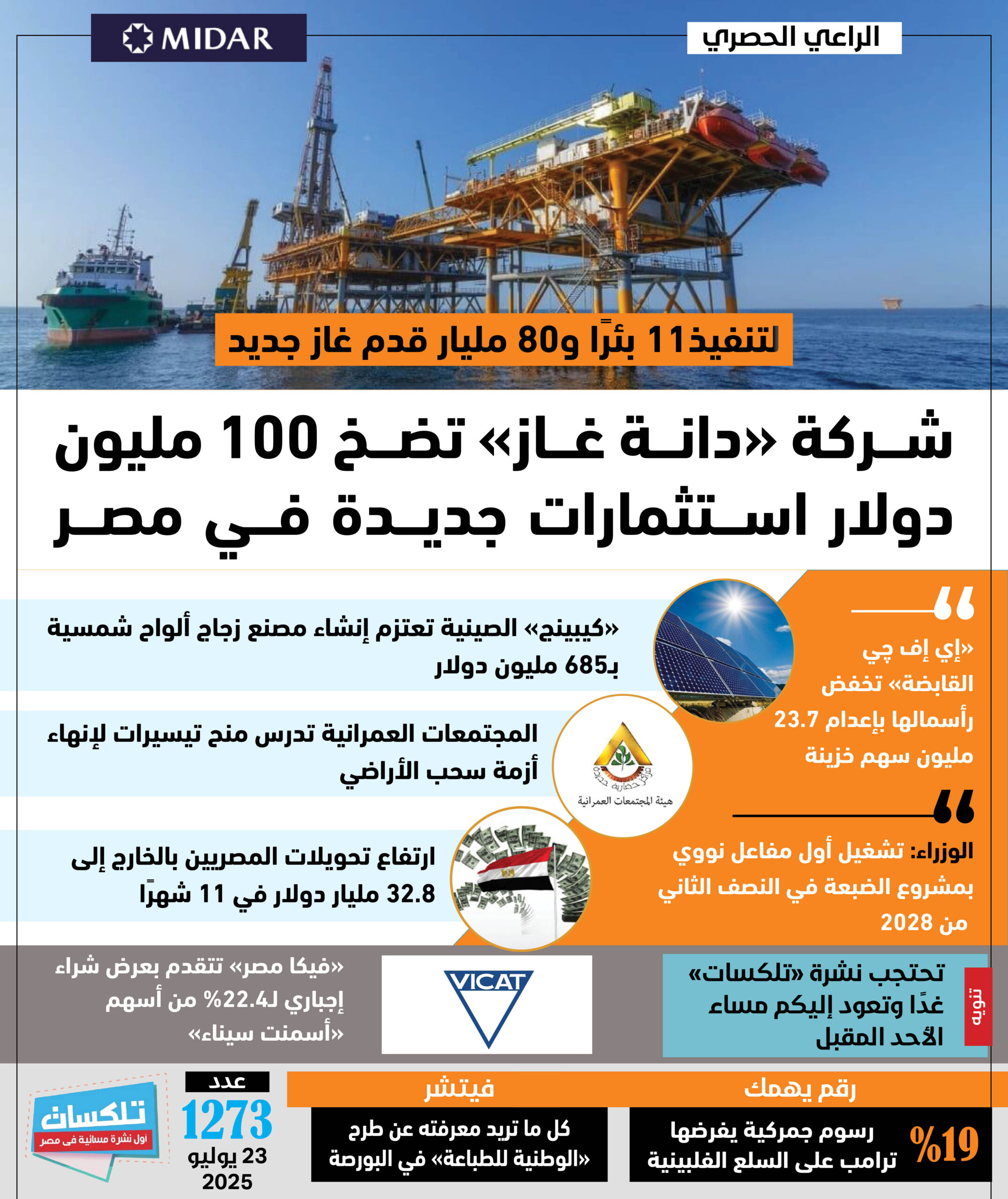 أول نشرة إخبارية مسائية فى مصر تطلقها جريدة الاستثمار العربى تأتيكم قبل العاشرة يوميا من الأحد إلى الخميس ..ونقرأ فيها ما يلي: